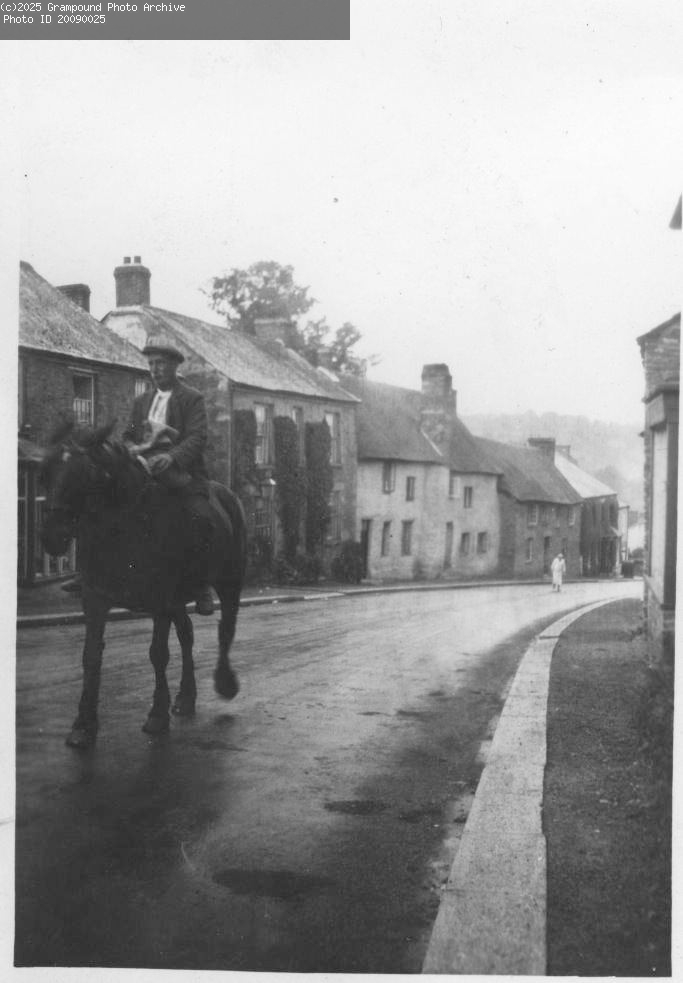 Arthur Brown on his horse in Fore Street near Hollies store.