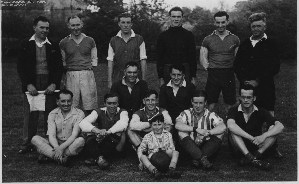 Grampound football team - 1948. Back row (from left) Ernie Cundie, Donald Olver, Charlie Rowe, Norman Mannell, Basil Spry, Sid Phillips referee. Middle row are (from left) Harold Cox and Kenneth Borden. Front row are (from left) William Pascoe, Harold Tregunna, Elvin Blake, Hedley Bennett, unknown. The mascot with the ball (front) is Ian Mannell.