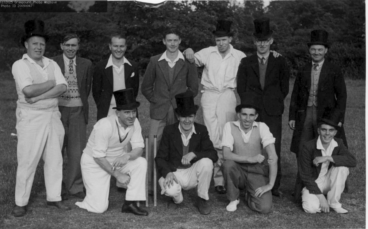 Grampound cricket team, some wearing top hats, date unknown. Back row (standing) (from left) are Bill James, Harold Tregunna, not known, Bill Knowles, Ian Croggon, Donald Olver, John Osborne. Front row (kneeling) (from left) are Ernie Cundie, Frank Paramore, Jack Nile, Brian Cundie.