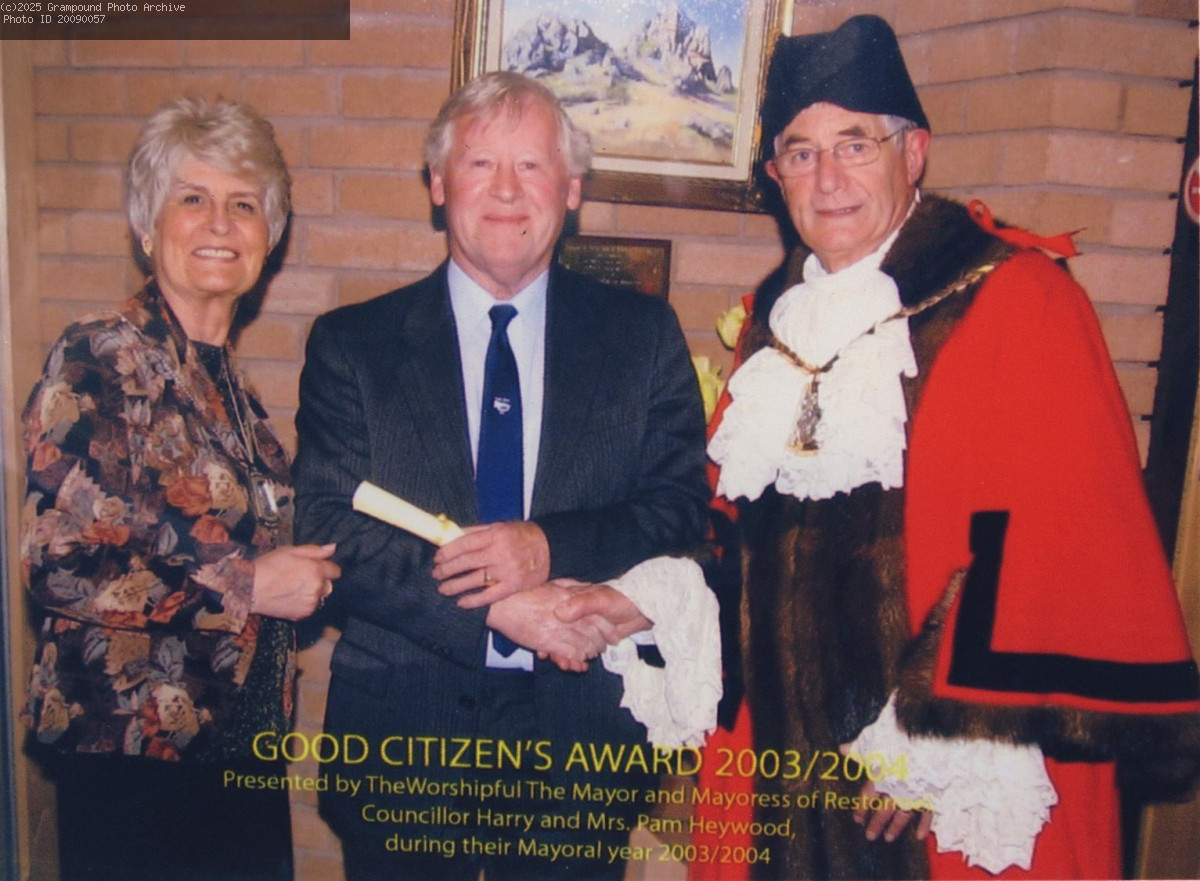 Ron Hicks receiving a Good Citizen's Award 2003-04 for his many contributions to the life of the village. These included winding the Town Hall clock for many years.