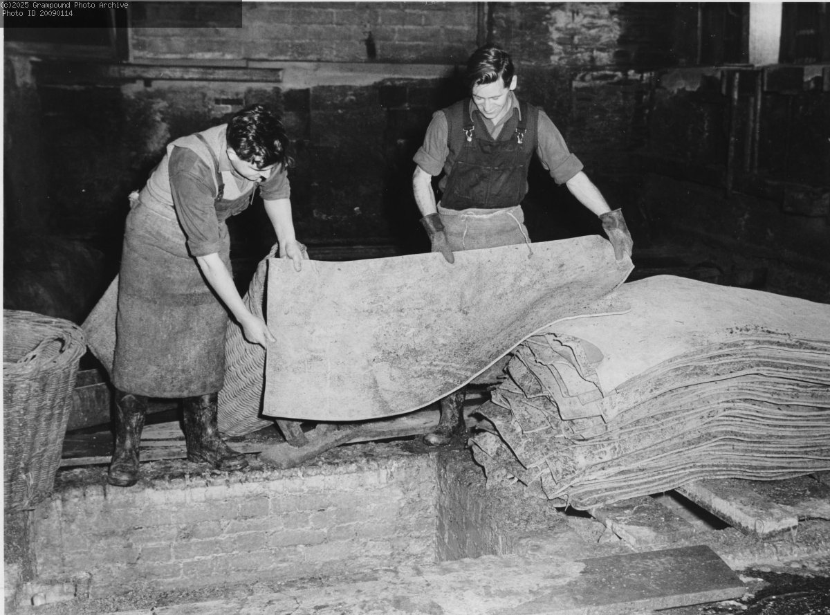 Ron Hicks and Ponto Priddle at Croggon's Tannery in 1960. They are placing a 'bend' of leather into the pit for curing; the pit contained an oak-bark solution.