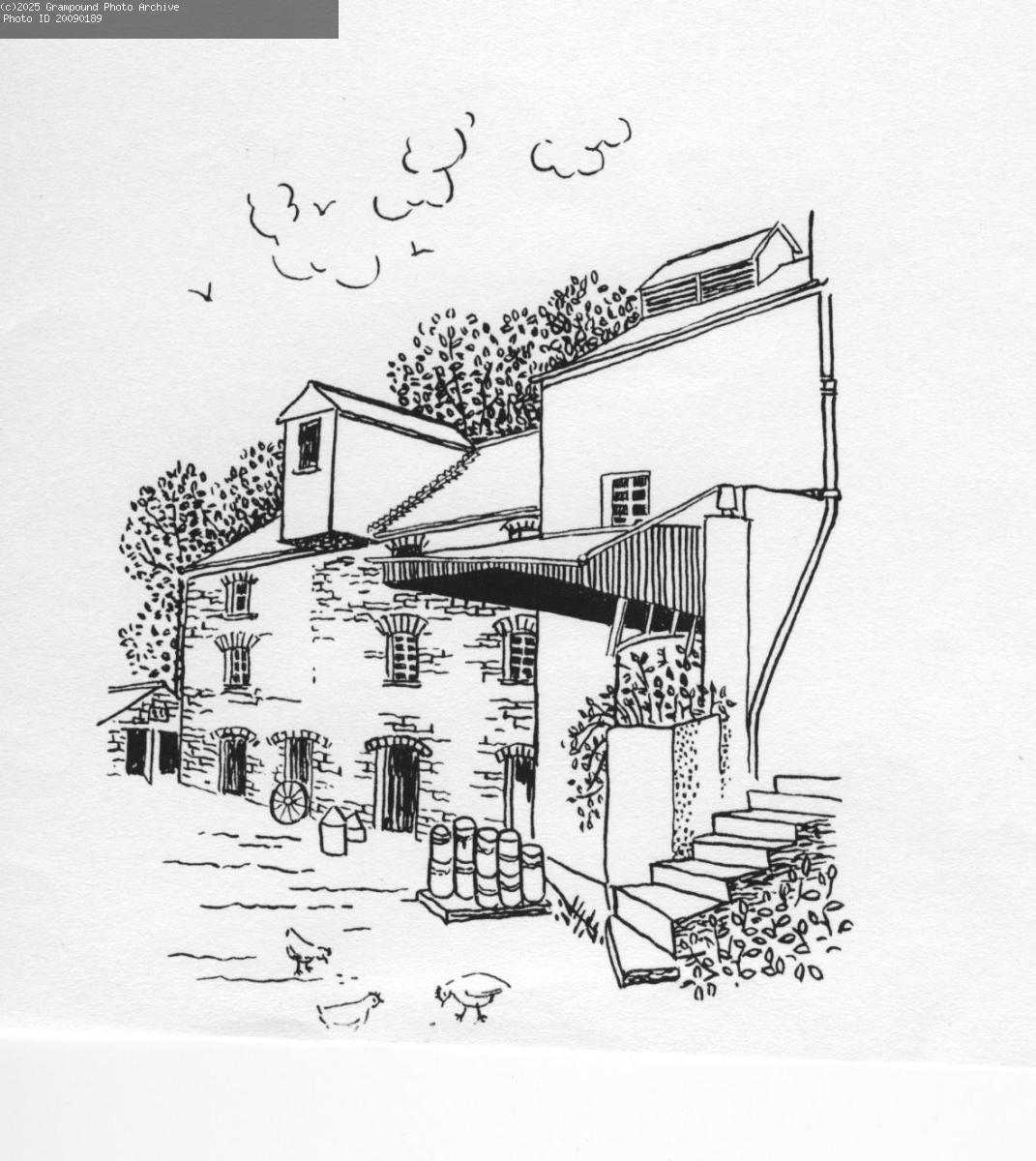 The Mill, Grampound. An original drawing for the Booklet, 'Grampound with Creed'‚ published in 1992 by Amy Bane and Mary Oliver. The corn mill ceased to operate c1965 but in 1992 the remains of the overshot wheel were still visible as were the mill leats. Water power was also used in the fulling mills that used to stand along Mill Lane.