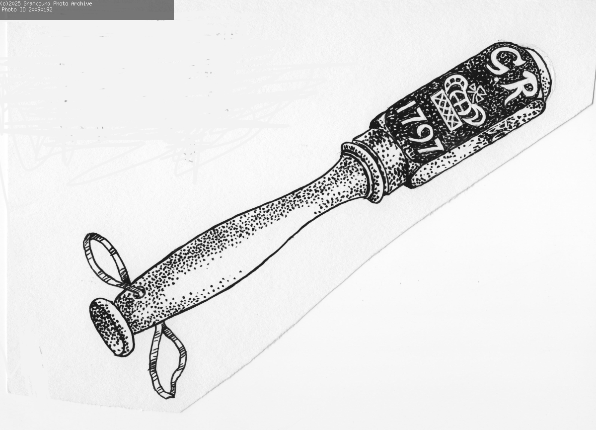 Borough of Grampound Constable's Staff 1797. It is of black painted wood but shows the remains of what appears to have been gold lettering etc. An original drawing by Mary Oliver.