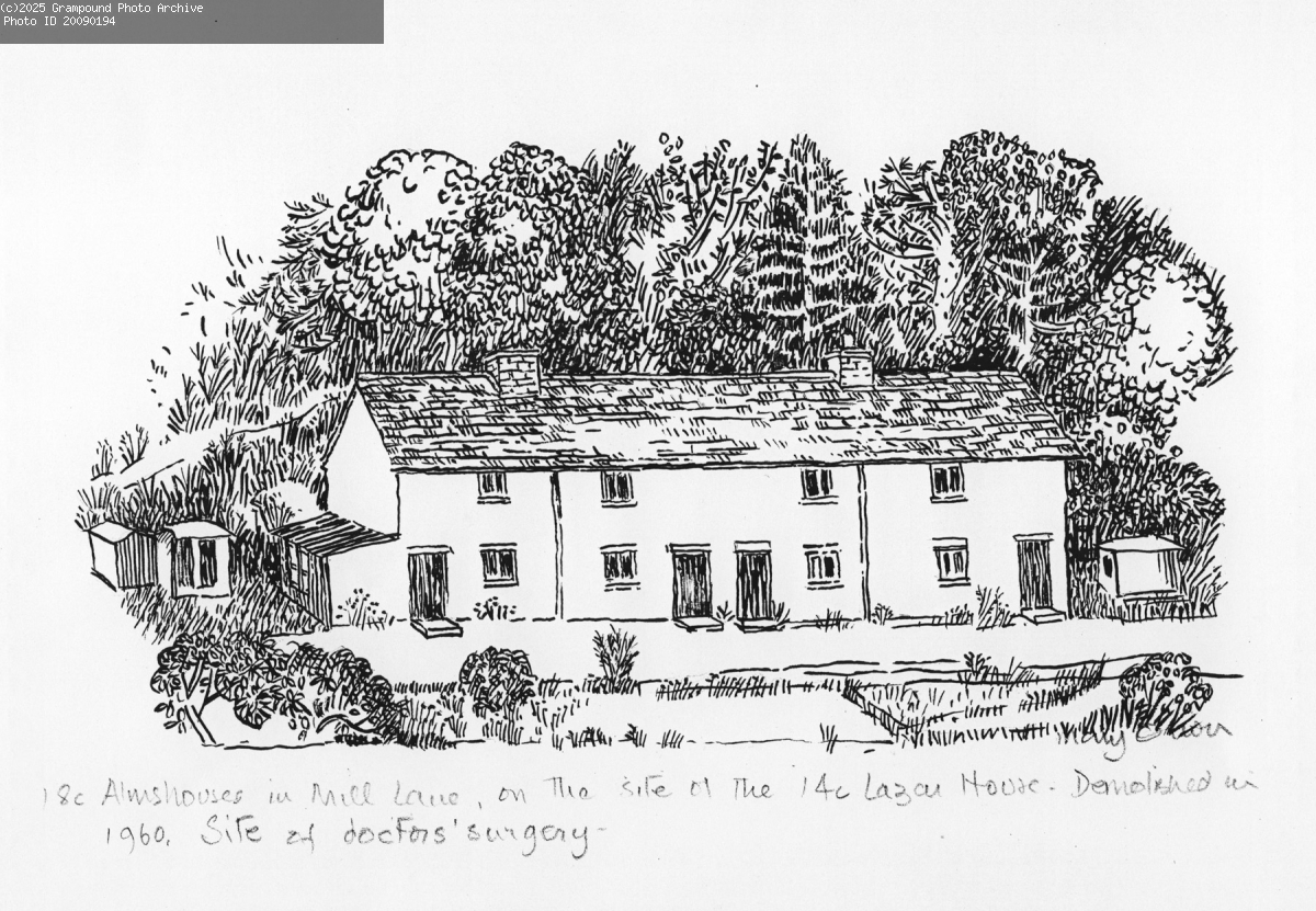An original drawing by Mary Oliver. The 18th century Almshouses that used to stand in Mill Lane. They were built on the site of a 14th century Lazar House ie house for lepers. The Almshouses were demolished in 1960. The Doctor's surgery now stands on the site.