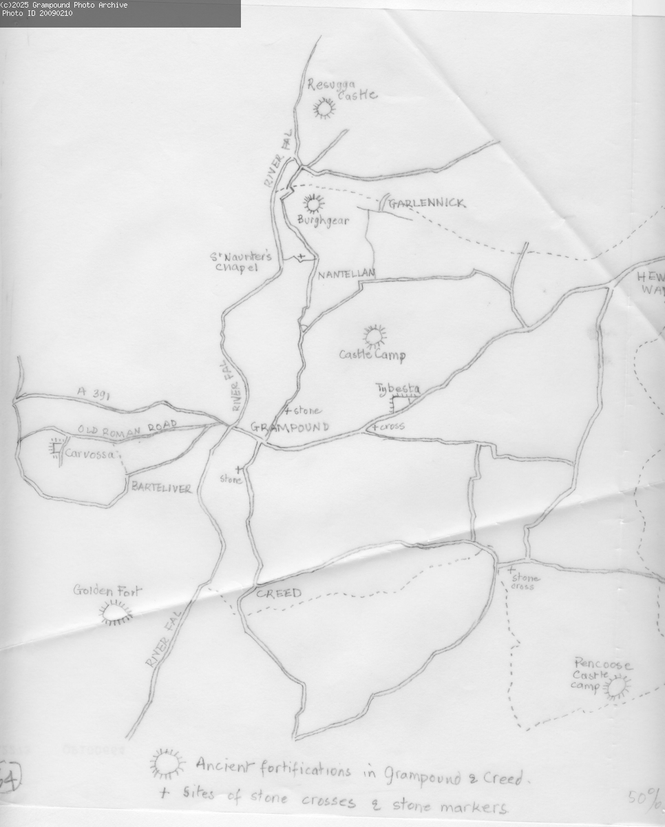 Sketch map drawn by Mary Oliver showing ancient features in Grampound and Creed.