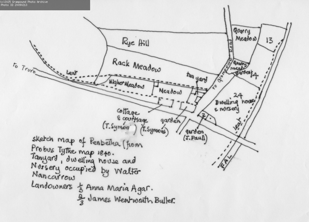 Sketch map drawn by Mary Oliver showing Penbetha; taken from the Probus tithe map of 1840. This is the area currently (2008) occupied by Fal Valley Pets. It was formerly a Tan Yard owned by the Bennett family and before that by the Nancarrow family.