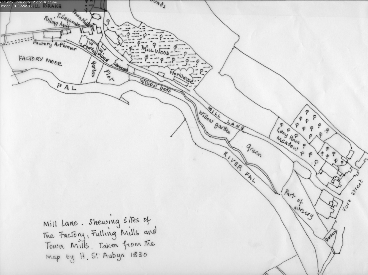 Sketch map drawn by Mary Oliver showing Mill Lane Grampound, sites of mills etc. Taken from the H St Aubyn map of 1831.