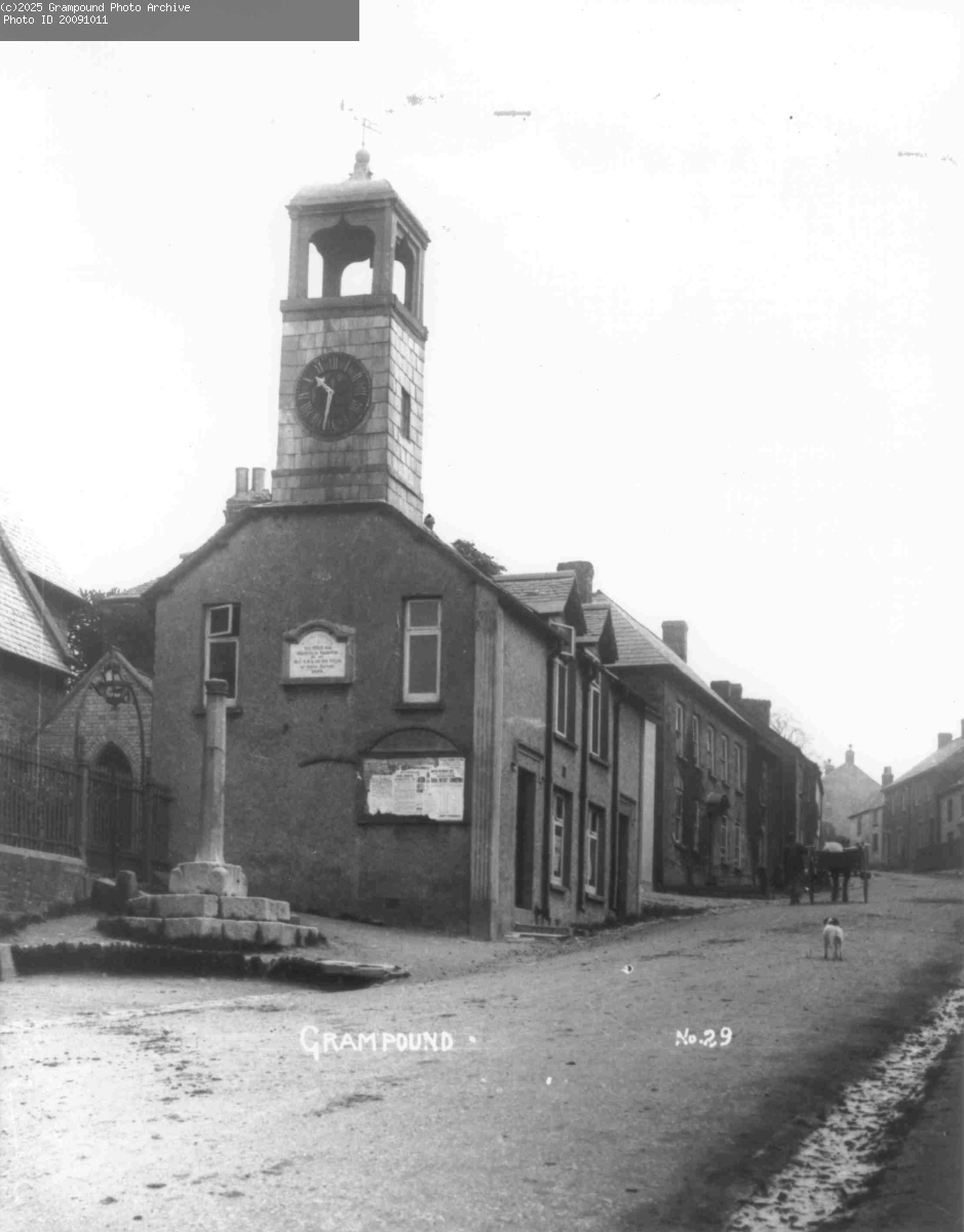 Town Hall and Market Cross. The Town Hall was once an open-sided Market Hall. St Nun's Church is just visible on the left. The present building dates from the 1860s and it was a Chapel of Ease, the Parish Church being at Creed.