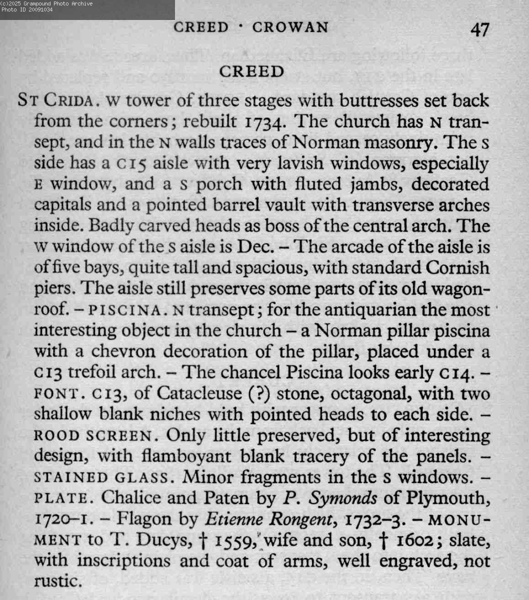 Information about Creed Church, the Parish Church of Grampound with Creed. The source of this information is not known.