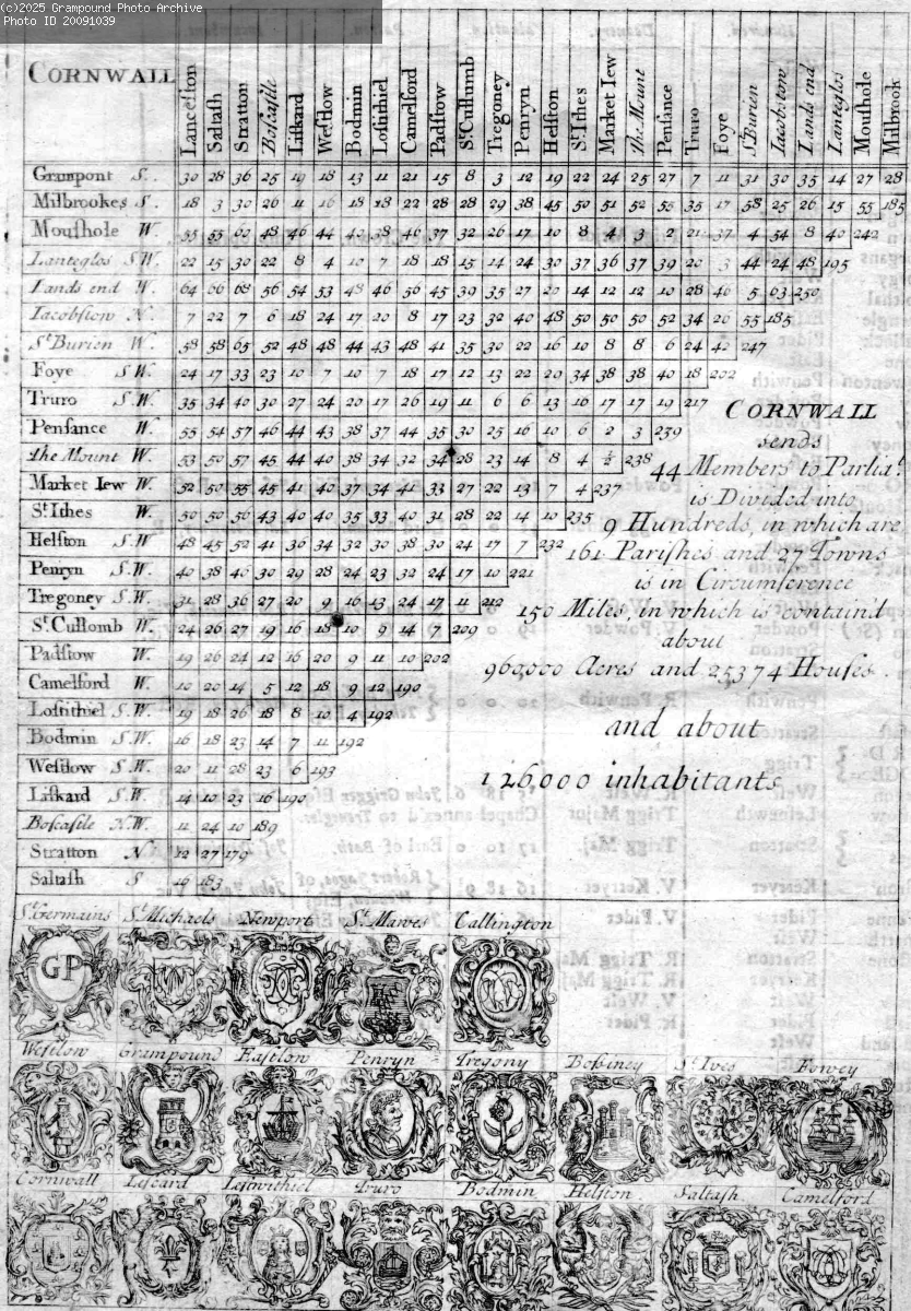 Chart giving distances between principal towns in Cornwall, MPs, Hundreds etc. Date unknown.