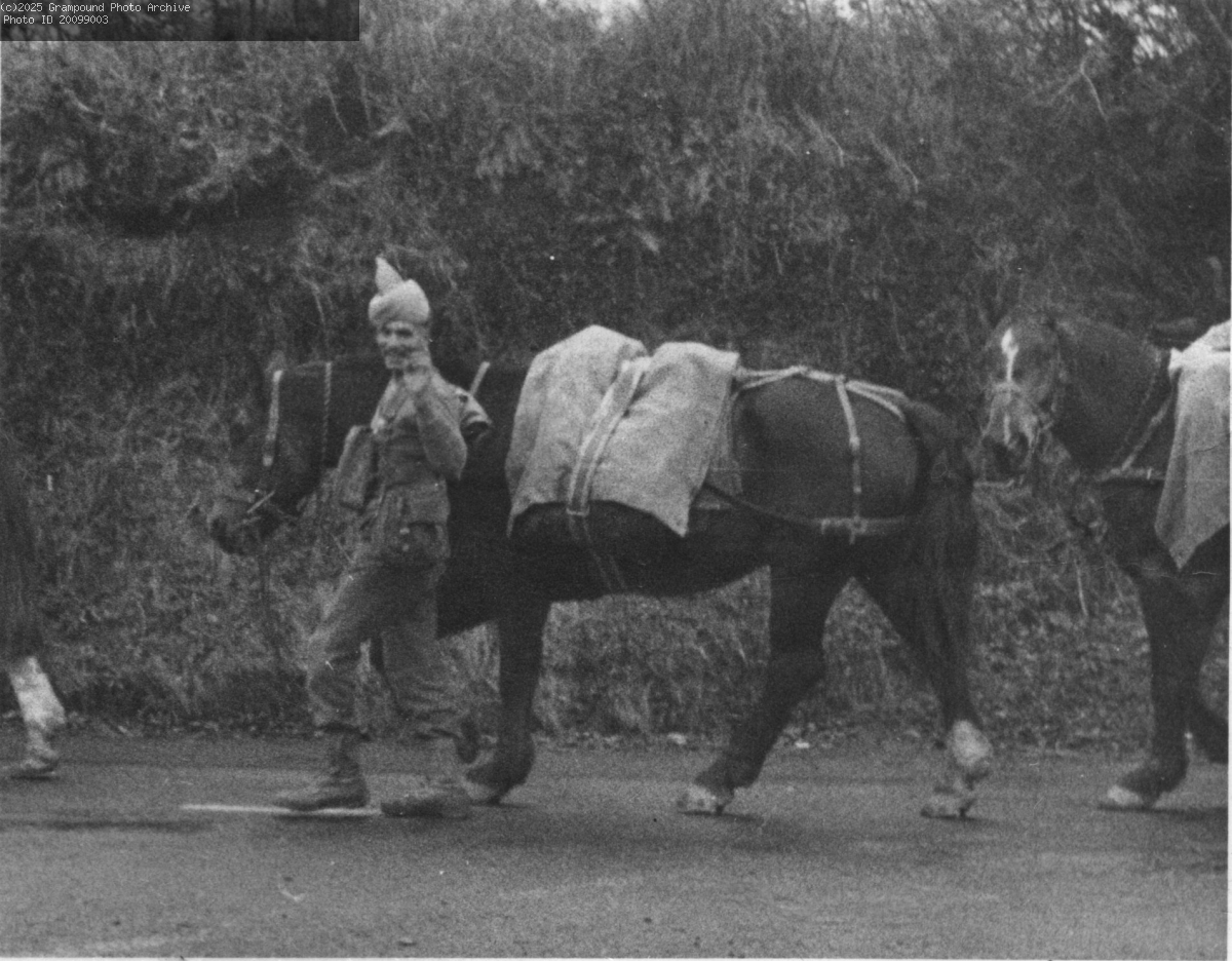 Indian contingent of the Army Service Corps with baggage ponies and mules. A familiar sight in Grampound during war time exercises in World War II.
