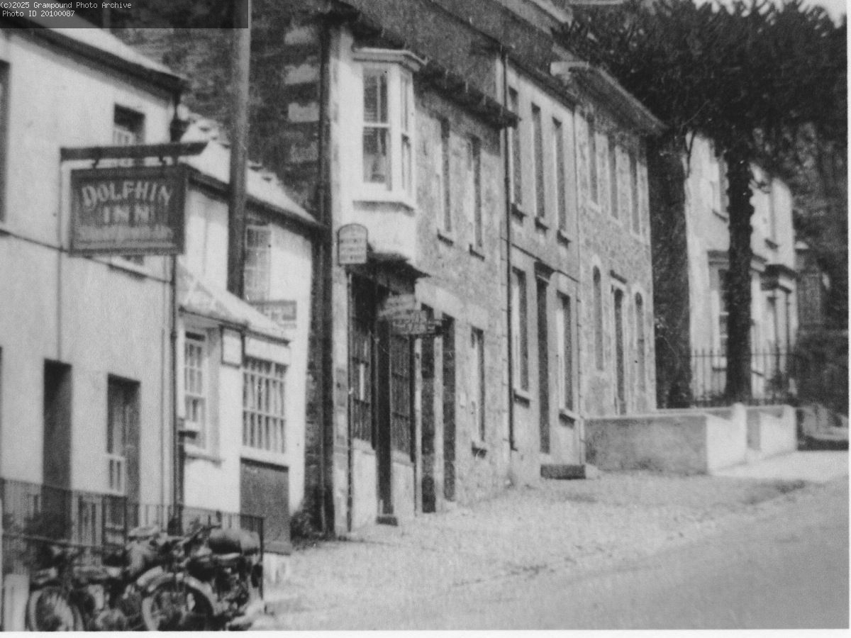Fore Street showing Dolphin Inn with Mrs Osborne's shop next door. This photograph was probably taken during World War 2. Mrs Osborne's shop later became known as 'Churchill's Store'.