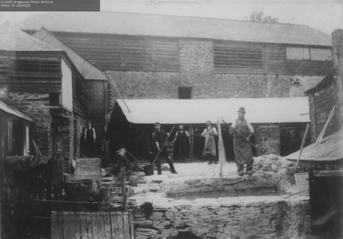 R Bennett and Son tannery, date unknown. The Nancarrow family previously owned this tannery. It stood where Fal Valley Pets now is (2008) - opposite the junction of Old Hill and the A390. The curing pits were in the open yard in front of the present buildings. It was also a slaughterhouse and, unlike Croggons, dealt with sheep skins as well as cow hides. Jack Juleff worked for this tannery for fifty years; Jack was one of the six children of Eva Juleff (nee Mannell) who lived at Trengoffe on Old Hill between the wars.