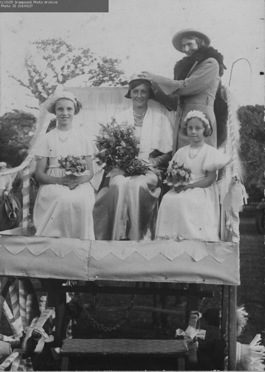 Carnival Queen 1939. The Carnival Queen is being crowned by Mrs Croggon. The attendants are (left) Phyllis Scholar, who later became a teacher and taught at Gorran School, and (right) Jean Juleff.