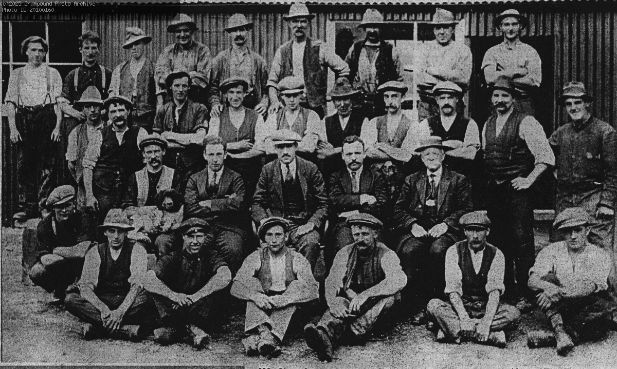 Miners at South Terras Mine c1926. South Terras Mine was located between St Stephen and Grampound Road. It was the only mine in Cornwall to produce uranium, although this mineral is widely distributed throughout the county. Madam Curie used South Terras uranium in her experiments. Standing on the far right is Harold Lander who later set up a radio business in St Stephen which he started by charging wireless accumulators. On the left of those seated on chairs is Martin Brenton who was the foreman of the mine; his daughter was a teacher at Grampound School. On the right of those seated on chairs is Mr Brenton Snr - father of Martin Brenton. Seated on the ground at the front third from the left is Mr Stanley Davey; he was the grandfather of Mrs Janette Cock, wife of Peter Cock, who used to run the Handyman Service in the village.