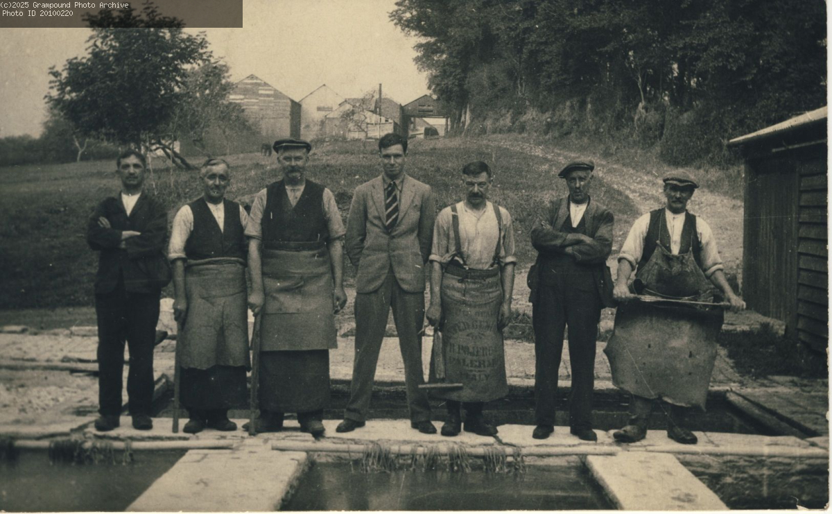 Staff at Croggon's tannery showing the bottom lime pits before they were covered. This is where the skins were soaked in a lime solution prior to tanning. In the centre is Ian Croggon, the father of William and John who last operated the tannery. Jack Allen is on the right, Tom Devonshire is 3rd from right. This was a postcard.