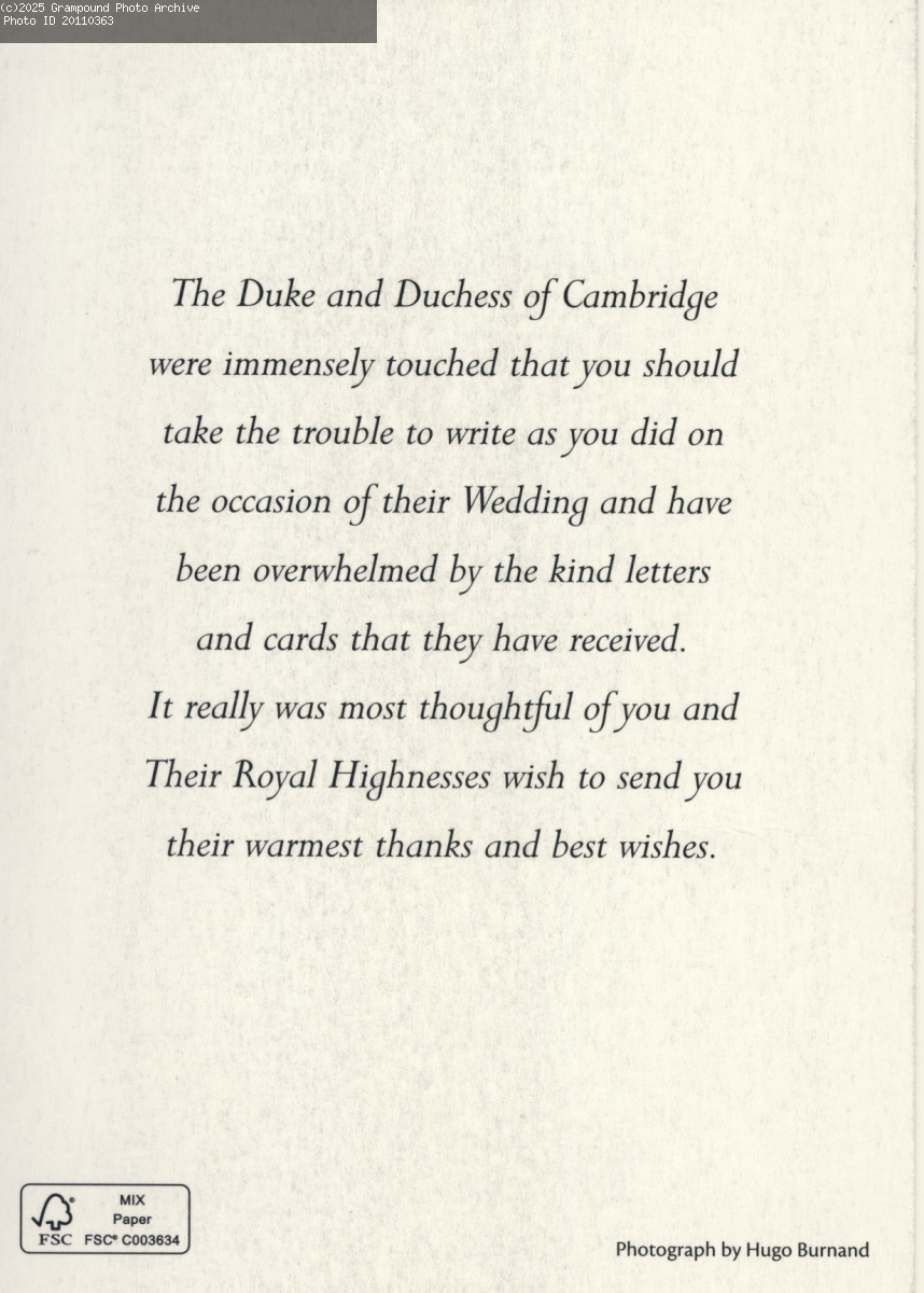 On the occasion of their marriage on 29th April 2011, the Grampound with Creed Parish Council sent a letter of congratulation to Kate Middleton and Prince William of Wales. On the morning of the wedding, it was announced from Buckingham Palace that their Royal Highnesses were to be styled 'Duke and Duchess of Cambridge'. Whenever the Duchess was referred to by her Christian name in the days after the wedding, it became accepted practice to call her 'Catherine'. She will be the sixth Queen Consort of England since 1066 to bear this name. This is their reply to the Grampound with Creed Parish Council letter.