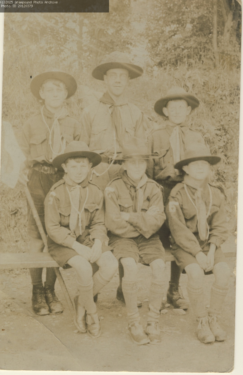 Back row (standing) (from left) Percy Rowlands (perhaps), Eric Bennett (scout leader), Eric Buckingham. Front row (seated) (from left) not known, Harold Tregunna, Ronnie Short. See also 20090049.