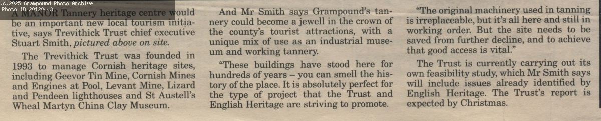 Cornish Guardian November 2000 - at the time the Manor Tannery ceased production. Discussion about use of site as a Heritage Centre.