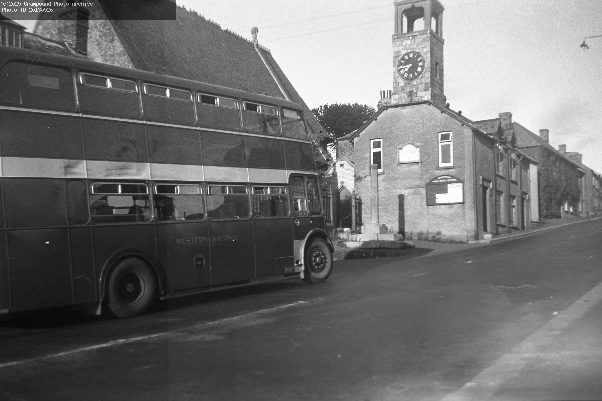 A Western National double decker bus in Grampound close to the junction between Fore Street and Pepo Lane. It is thought that this was just post-WW2. The War Memorial Plaque is missing from the Town Hall.