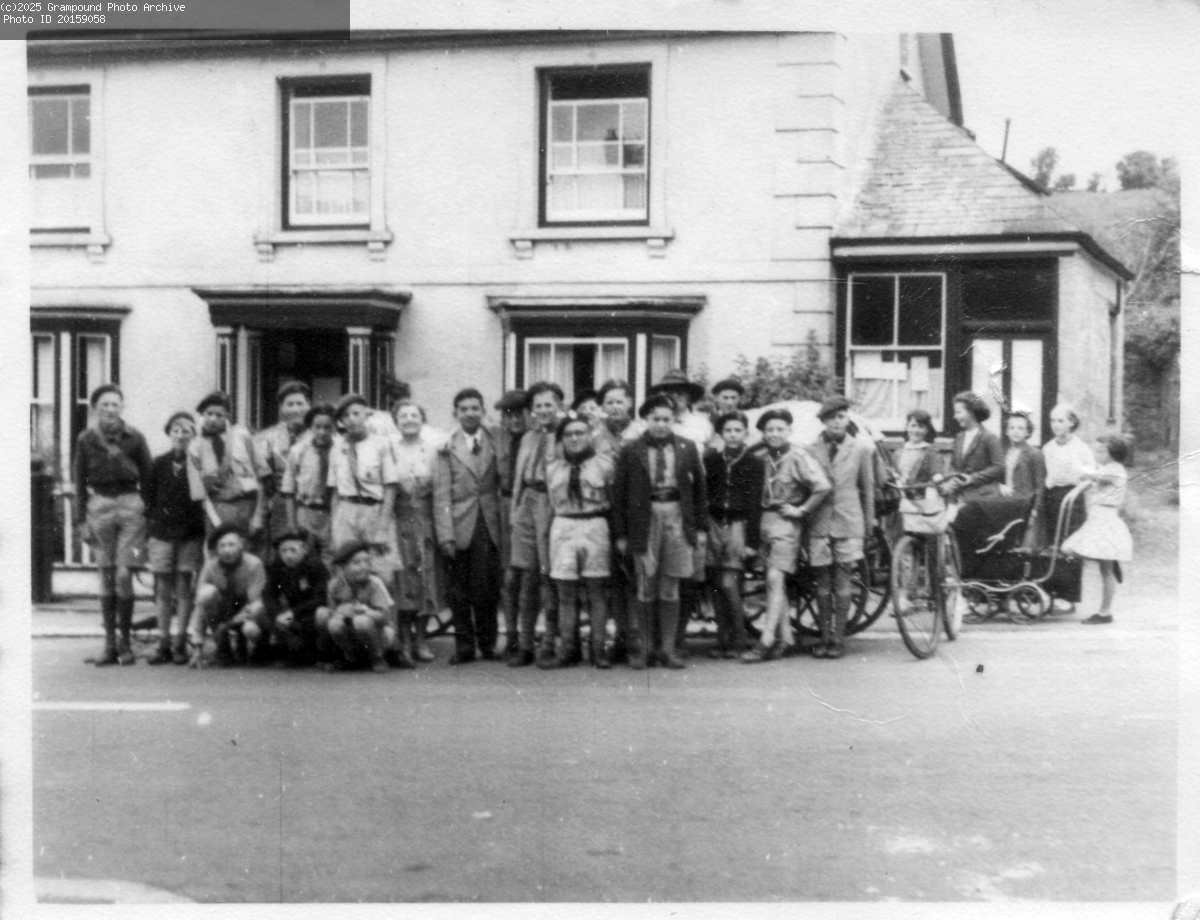 The scout troop outside Trevail, Fore Street. The right hand section was a Barber's Shop. The original is dated 1951 and is with the scout archives in the Heritage Centre.