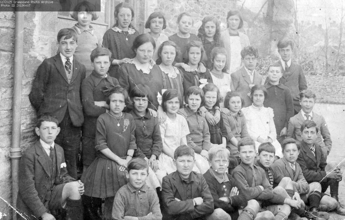 a group of older schoolchildren. L to R, back row, B Richards, M Brown, I Farrow, I Lawry, G Gummow, R Tregunna. Middle row, C Ford, L Cundy, M Binney, G Pascoe, R Lamerton, M Hosking, E Mannell, K Edwards, B Mitchell. 3rd row, C Brown, W Jones, O Coombe, B Jones, D Nancarrow, F Osborne, A Luke, W Juleff. Front row B Binney, W Pascoe, H Bosankoe, K Roberts, C Nancarrow, L Pollard, F Brown, F Spry